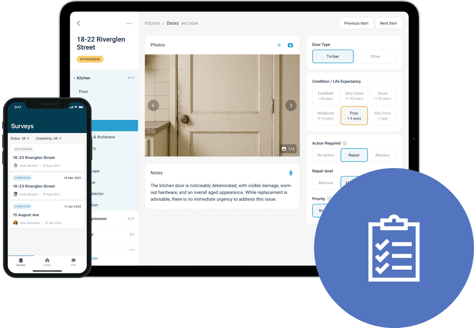 Assess life expectancy, repairs levels, priority & action items for each component within an individual or multi-unit property